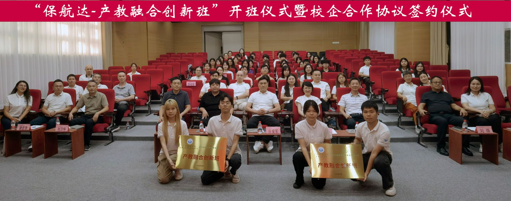 随后,校企双方代表共同签署《校企合作协议》。协议明确了双方在人才培养、课程共建、实习培训、就业推荐等方面的合作内容,为创新班的长效运行提供了制度保障。签约完毕,双方共同为“保航达-产教融合创新班”揭牌,红色幕布落下,标志着创新班正式启动,现场掌声雷动。